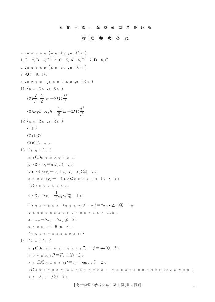 安徽省阜阳市2024-2025学年高一年级期末教学质量检测 物理答案.pdf