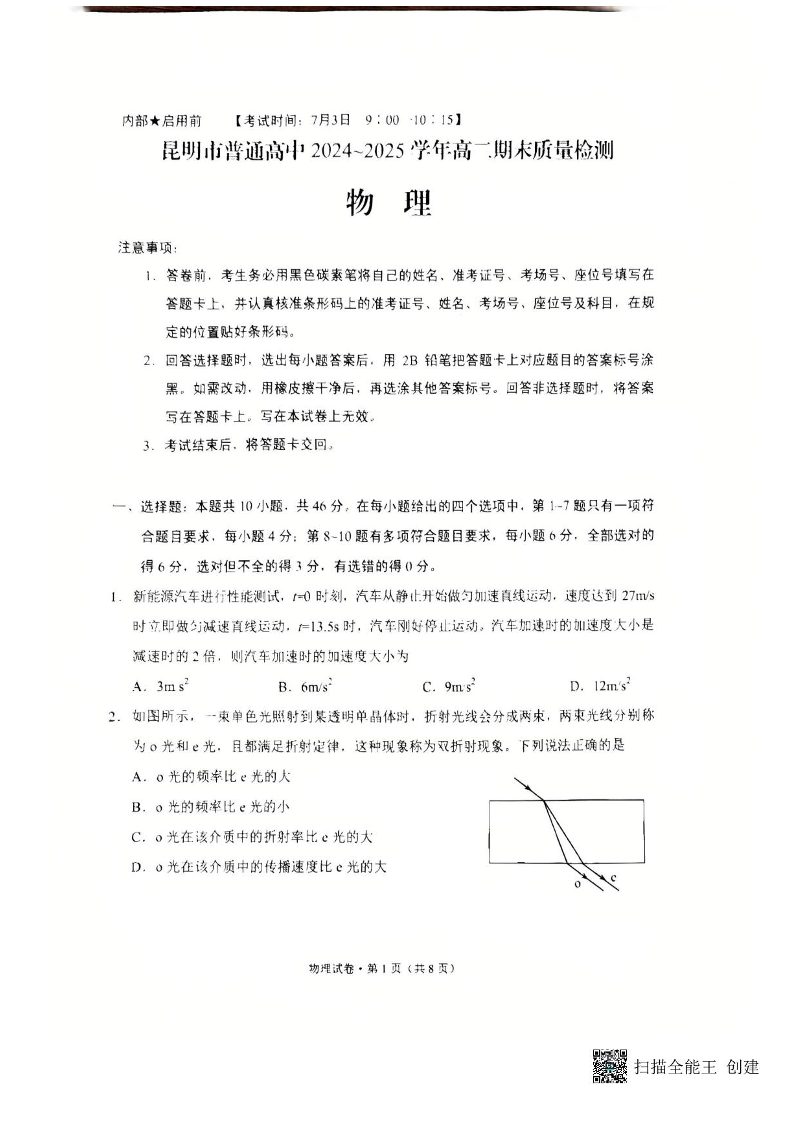 昆明市普通高中2024-2025学年高二期末质量监测 物理试卷(含答案).pdf