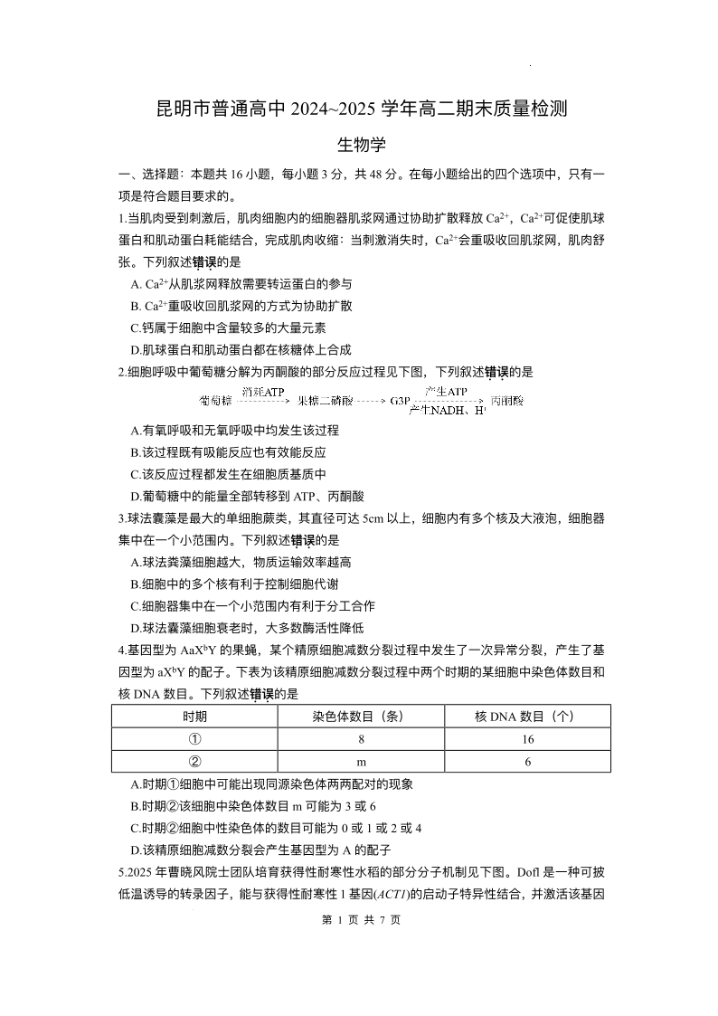 昆明市普通高中2024-2025学年高二期末质量监测 生物试卷(含答案).pdf