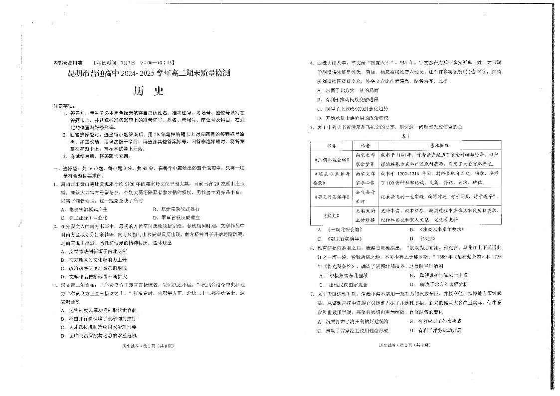 昆明市普通高中2024-2025学年高二期末质量监测 历史试卷(含答案).pdf
