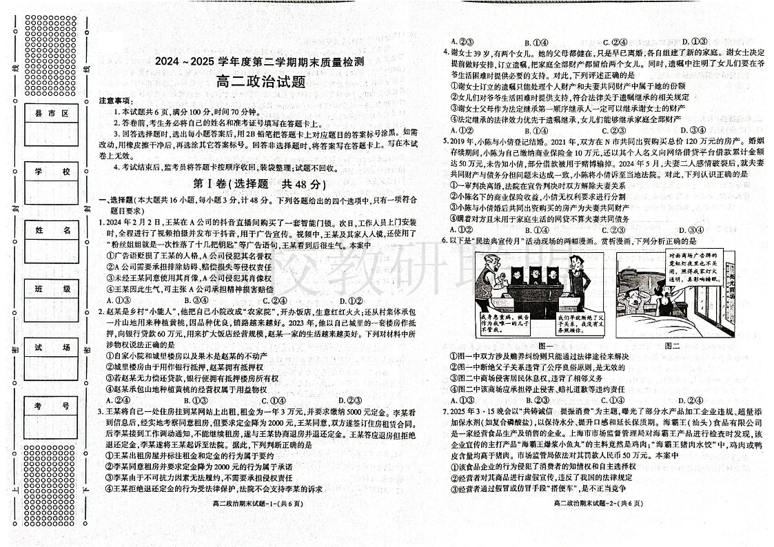 陕西省西安市新城区2024-2025学年高二下学期期末质量检测 政治试题(含答案).pdf