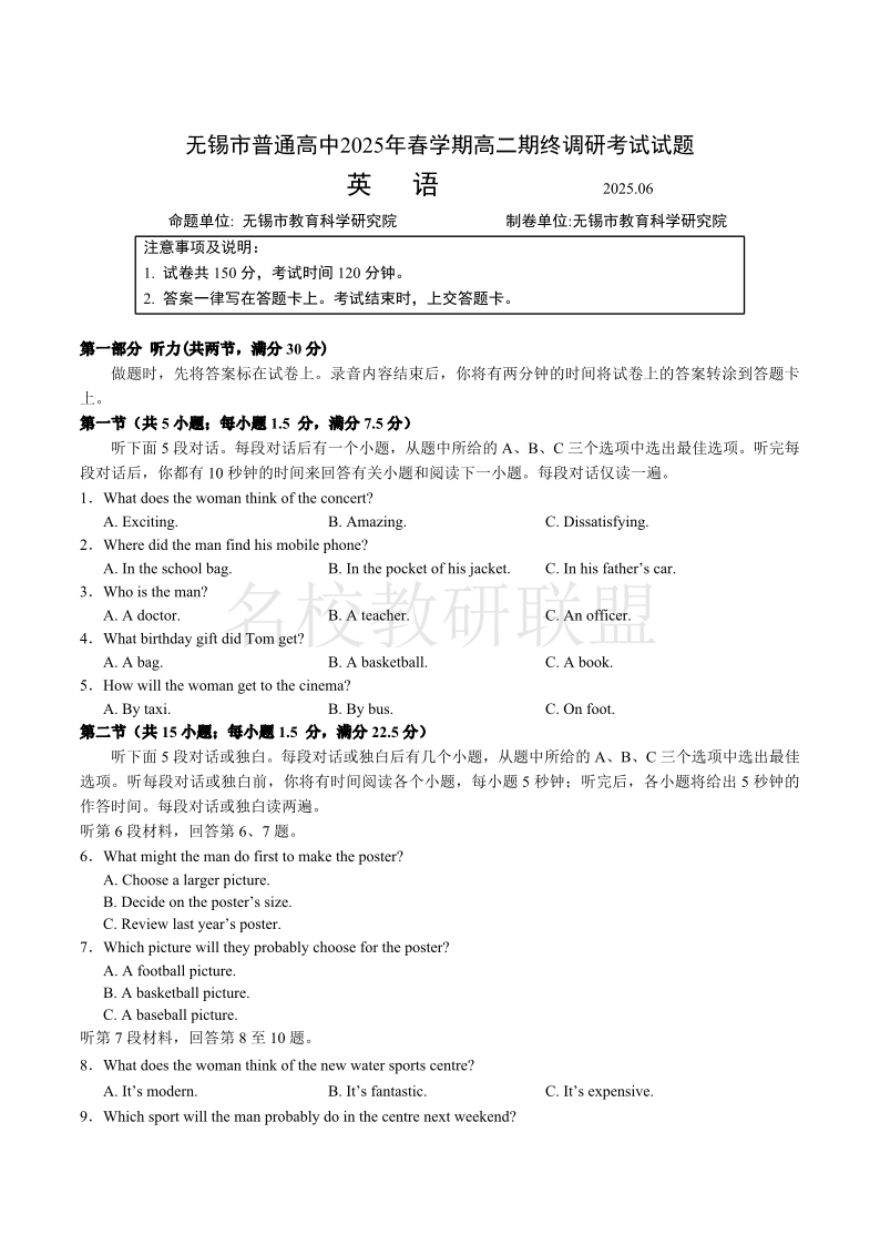 江苏省无锡市普通高中2024-2025学年高二下学期期末考试 英语试卷(含答案).pdf