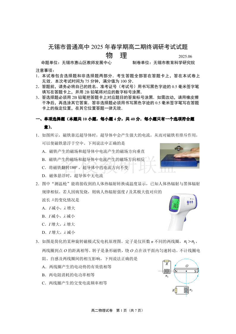 江苏省无锡市普通高中2024-2025学年高二下学期期末考试 物理试卷(含答案).pdf
