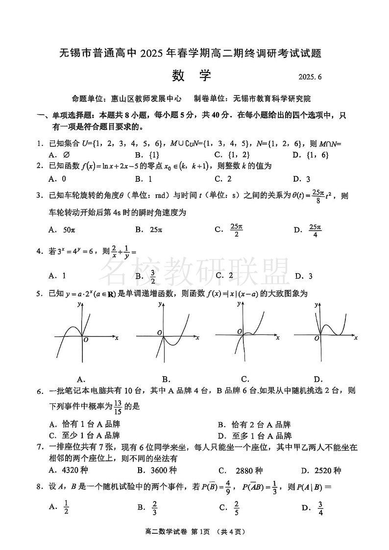 江苏省无锡市普通高中2024-2025学年高二下学期期末考试 数学试卷(含答案).pdf