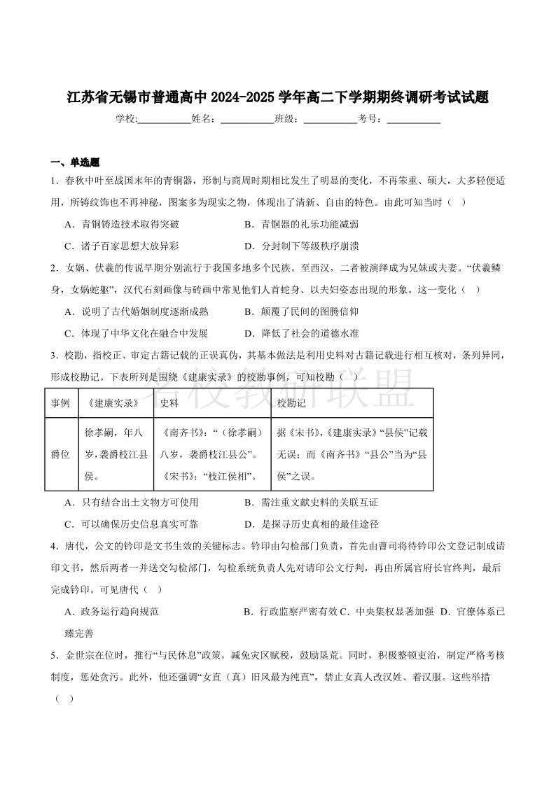 江苏省无锡市普通高中2024-2025学年高二下学期期末考试 历史试卷(含答案).pdf