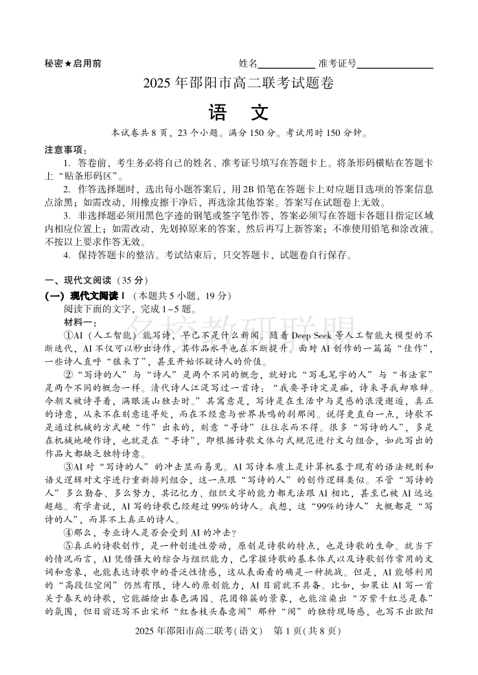 湖南省邵阳市2025年高二下学期期末考试 语文试题(含答案).pdf