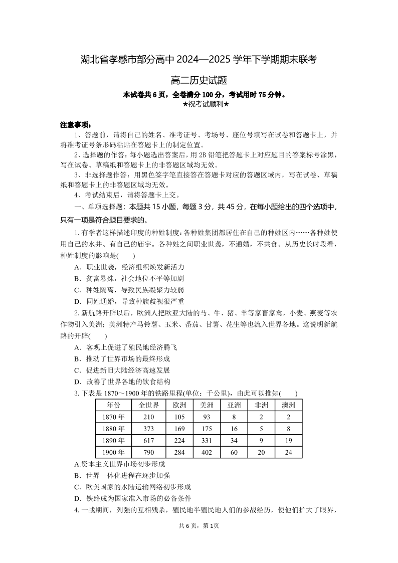 孝感市部分高中联考2024-2025学年高二下学期7月期末联考 历史.pdf