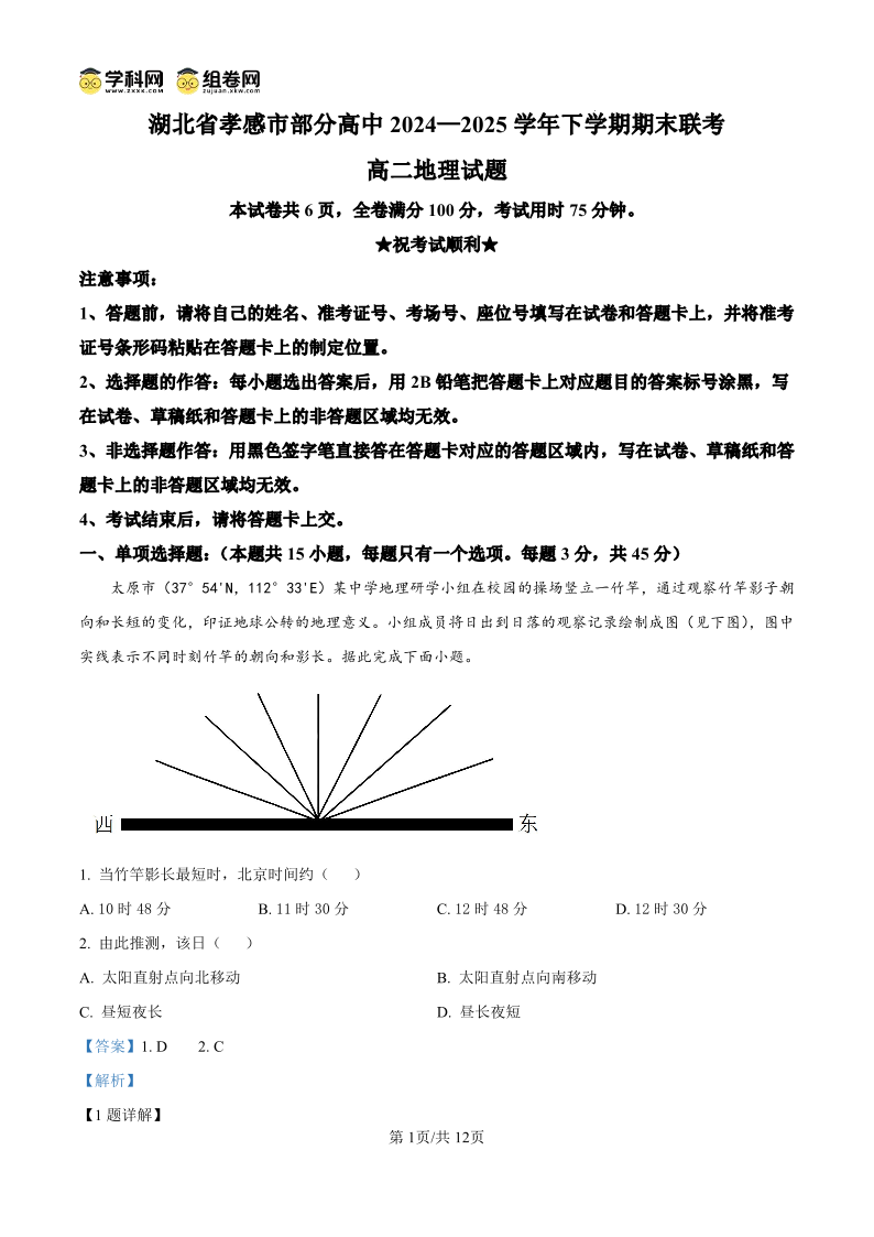 孝感市部分高中联考2024-2025学年高二下学期7月期末联考 地理答案.pdf
