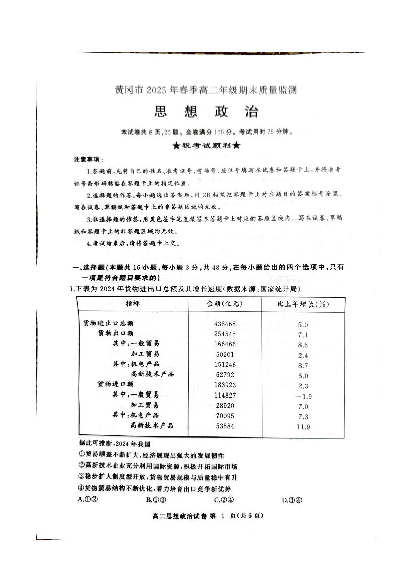 湖北省黄冈市2025年春季高二年级期末质量监测 政治试卷(含答案).pdf
