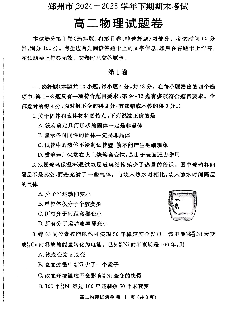 河南省郑州市2024-2025学年下期高二年级下学期末考试 物理.pdf