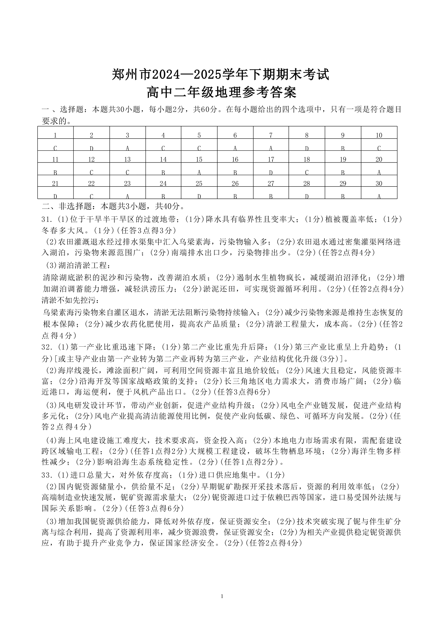 河南省郑州市2024-2025学年下期高二年级下学期末考试 地理答案.docx