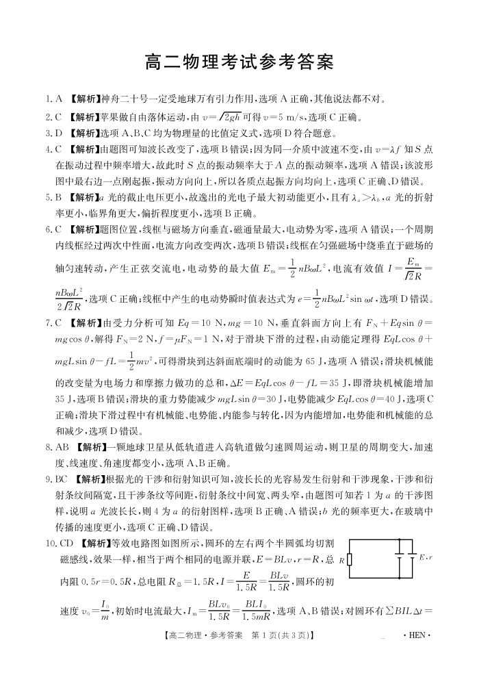河南省2024-2025学年高二下学期6月百万大联考 物理答案.pdf