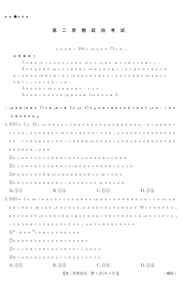 河南省2024-2025学年高二下学期6月百万大联考 思想政治.pdf