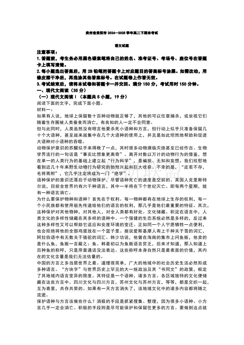 贵州省贵阳市2024-2025学年高二下学期期末考试 语文试卷(含答案).pdf