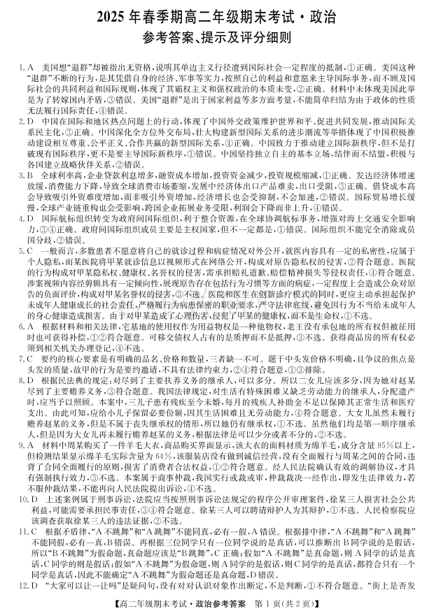 梧州市2025年春季期高二年级7月期末考试 政治答案.pdf