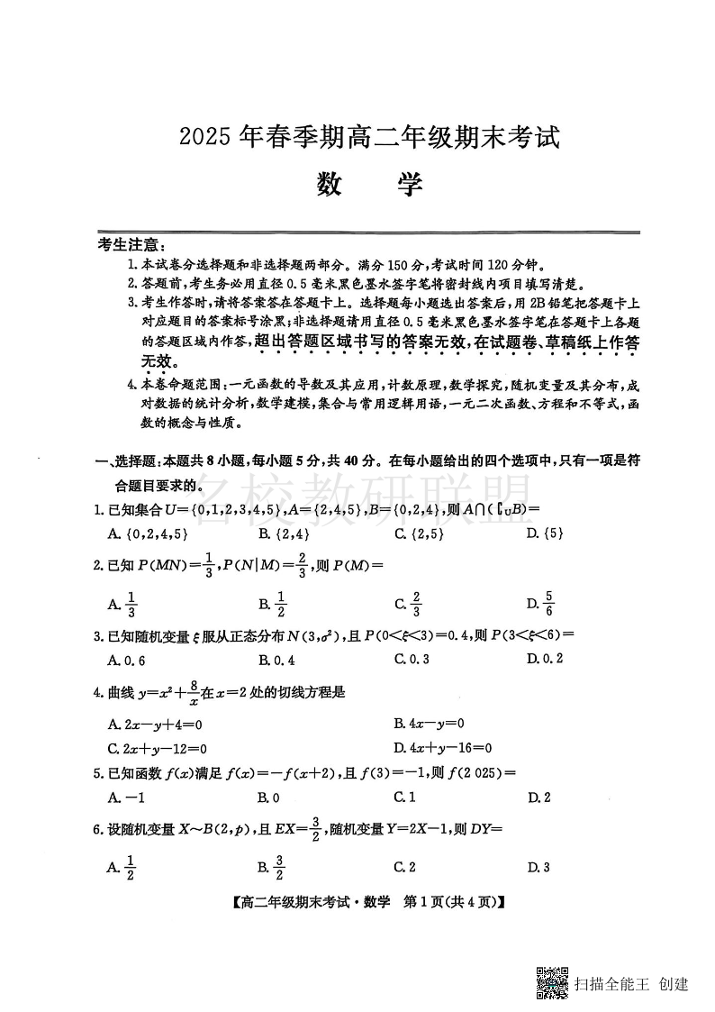梧州市2025年春季期高二年级7月期末考试 数学.pdf