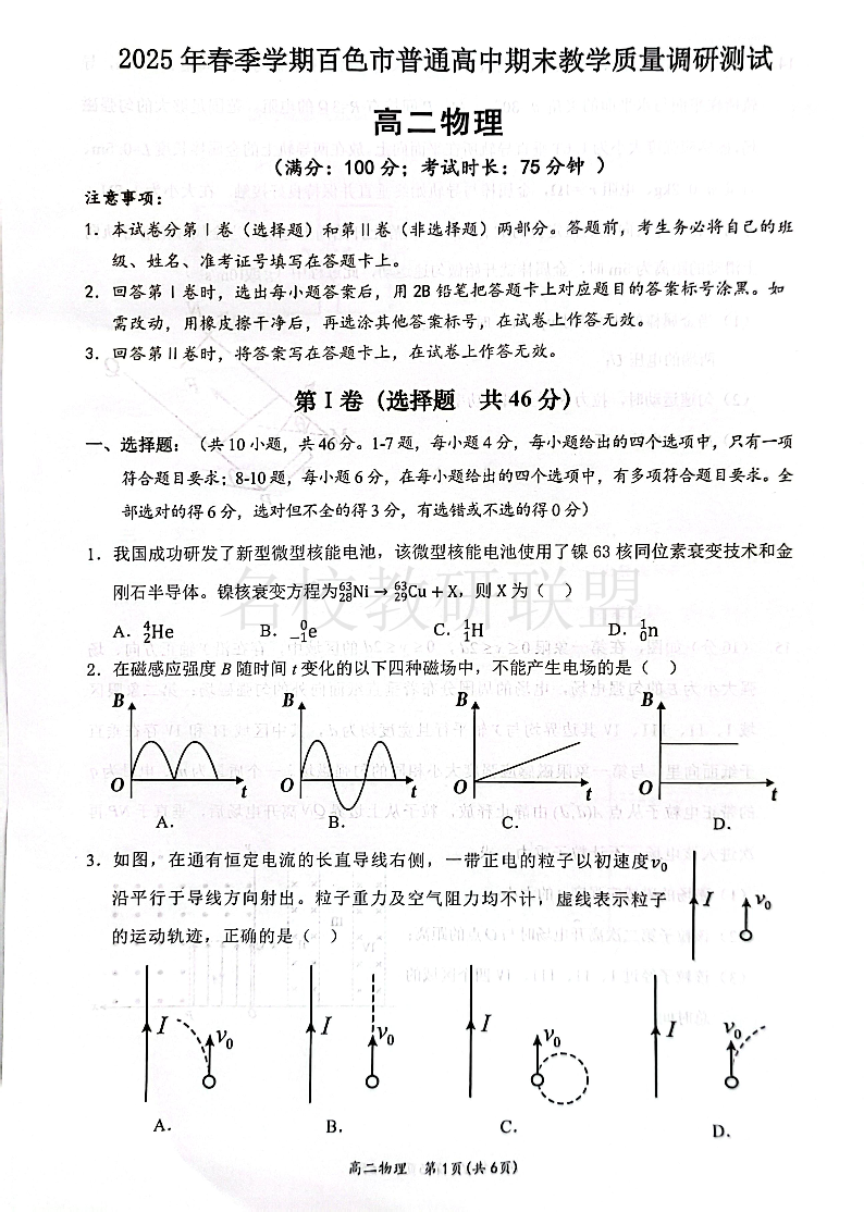 2025年春季学期百色市普通高中高二年级期末教学质量调研测试 物理试卷(含答案).pdf