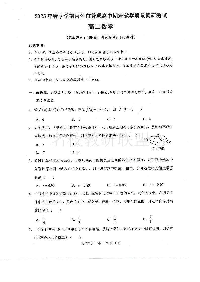 2025年春季学期百色市普通高中高二年级期末教学质量调研测试 数学试卷(含答案).pdf
