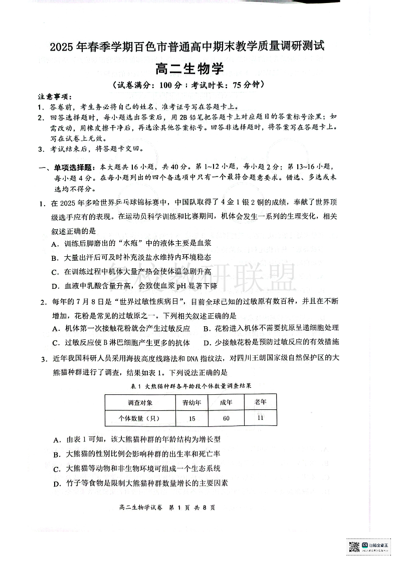 2025年春季学期百色市普通高中高二年级期末教学质量调研测试 生物试卷(含答案).pdf