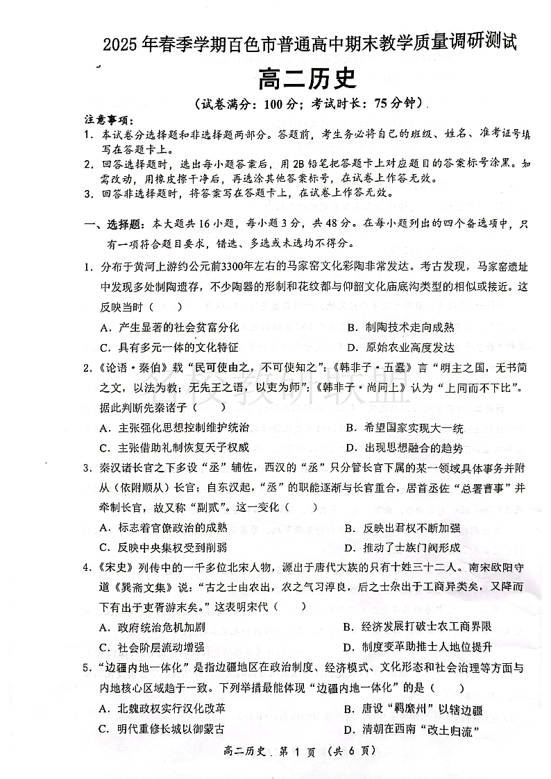 2025年春季学期百色市普通高中高二年级期末教学质量调研测试 历史试卷(含答案).pdf