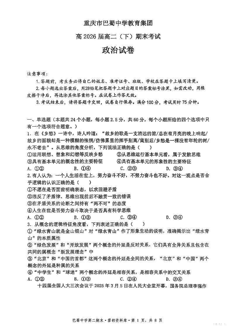 重庆市巴蜀中学教育集团高2026届高二(下)期末考试 政治试卷(含答案).pdf