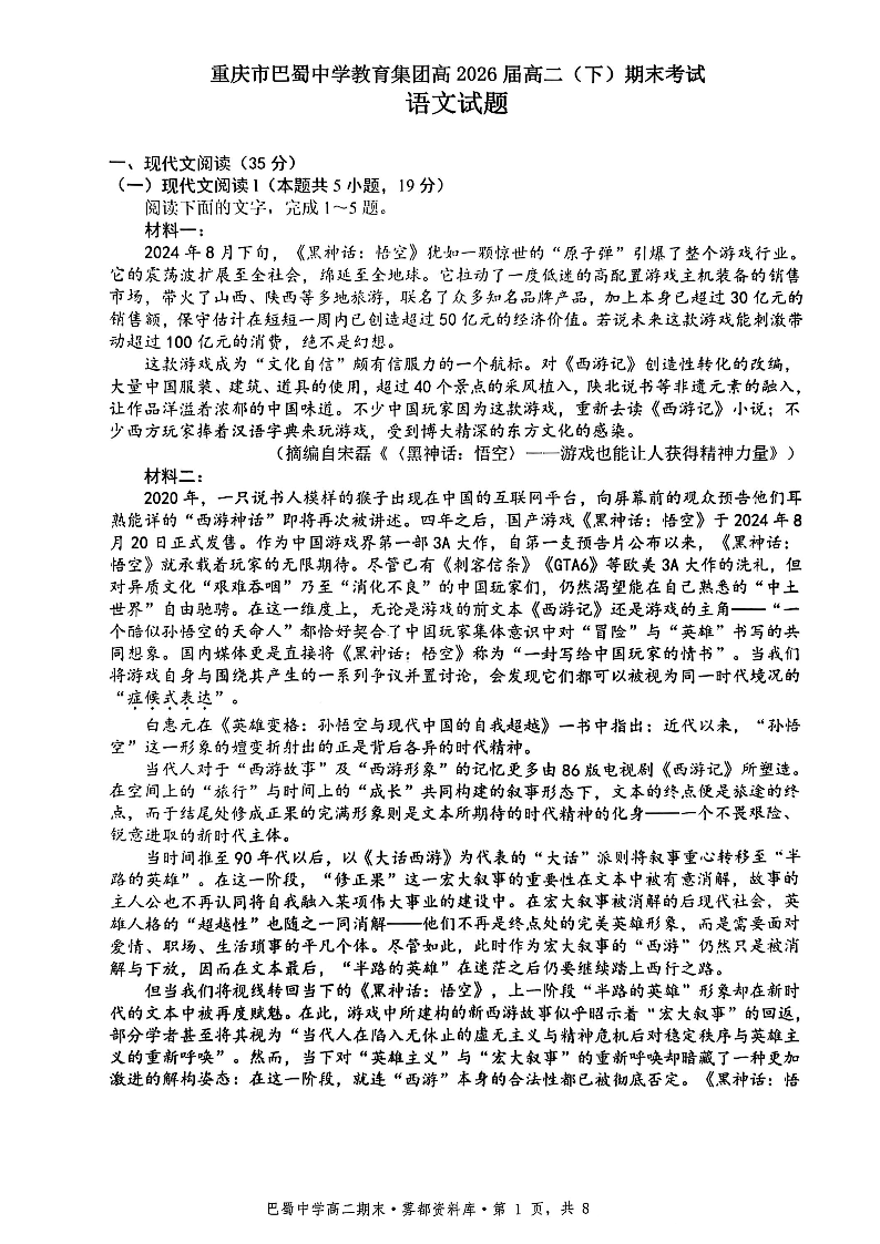 重庆市巴蜀中学教育集团高2026届高二(下)期末考试 语文试卷(含答案).pdf