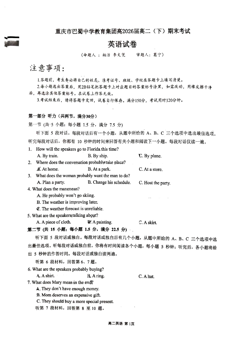 重庆市巴蜀中学教育集团高2026届高二(下)期末考试 英语试卷(含答案).pdf