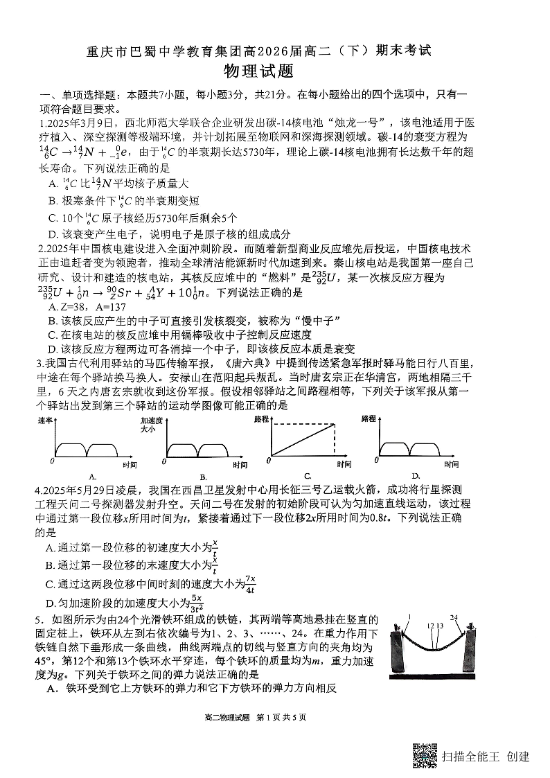 重庆市巴蜀中学教育集团高2026届高二(下)期末考试 物理试卷(含答案).pdf