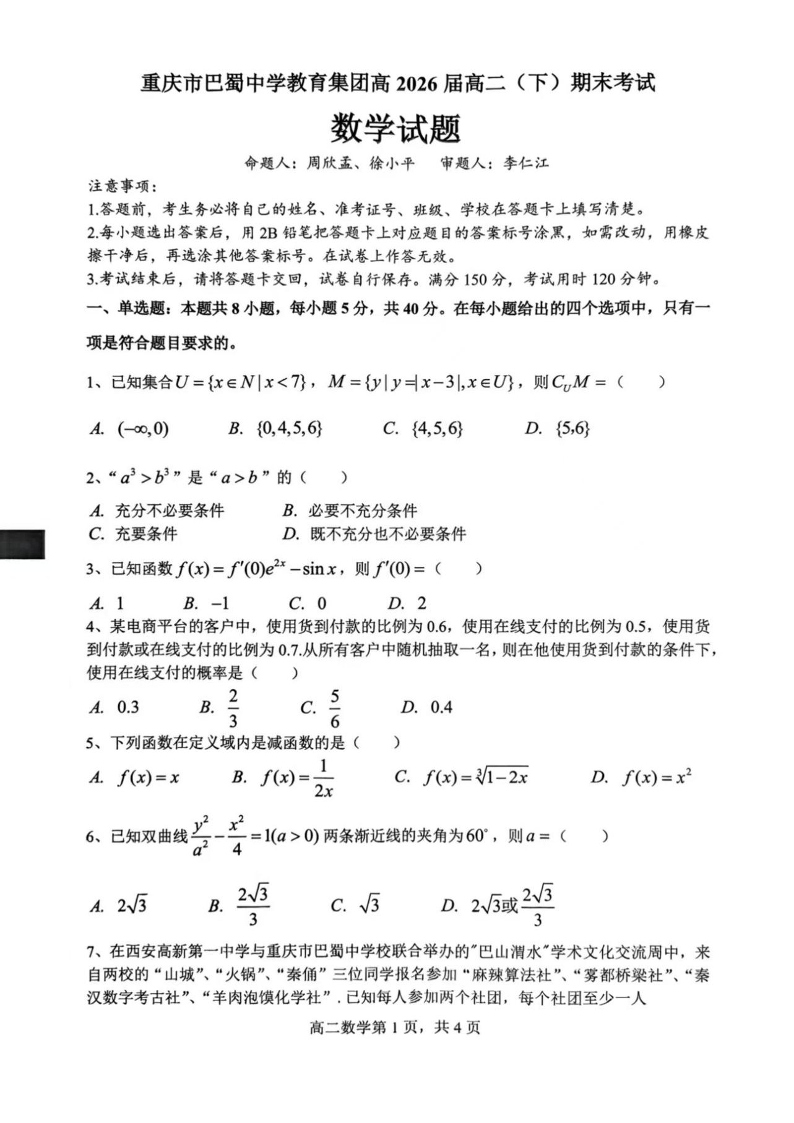 重庆市巴蜀中学教育集团高2026届高二(下)期末考试 数学试卷(含答案).pdf