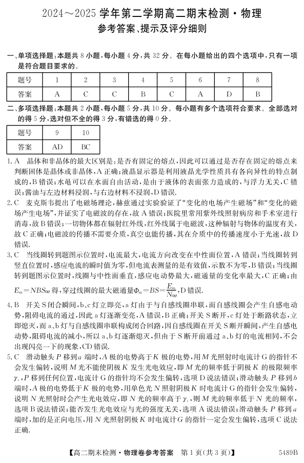 安徽省县中联盟2024-2025学年第二学期高二期末检测 物理答案.pdf