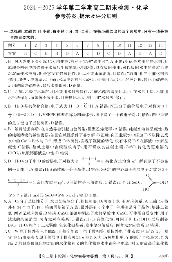 安徽省县中联盟2024-2025学年第二学期高二期末检测 化学答案.pdf