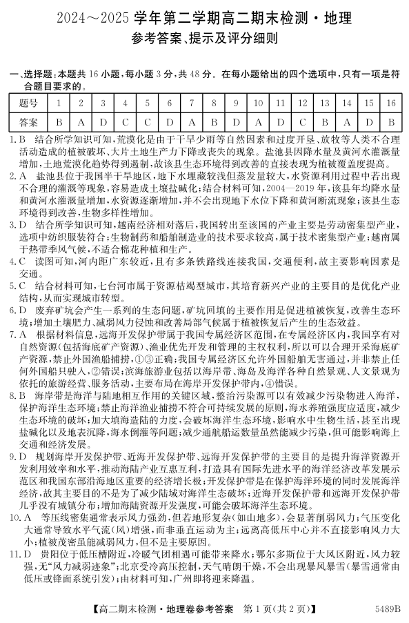 安徽省县中联盟2024-2025学年第二学期高二期末检测 地理答案.pdf