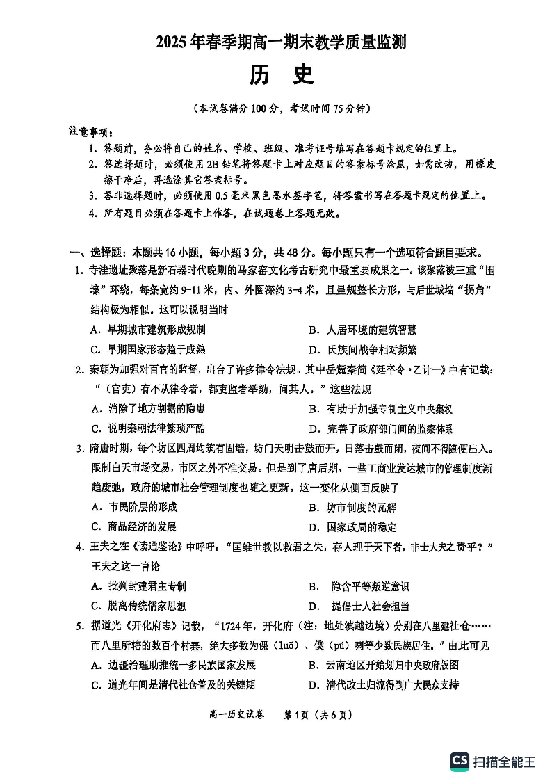 玉林市2025年春季期高一期末教学质量监测 历史.pdf