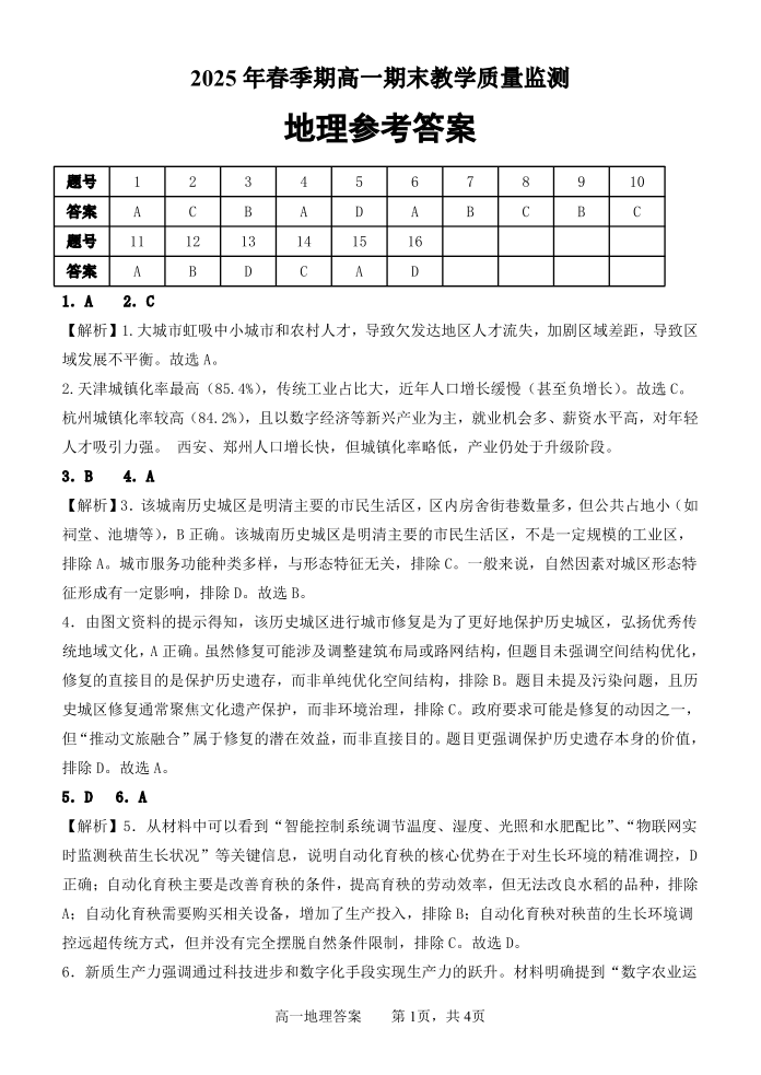 玉林市2025年春季期高一期末教学质量监测 地理答案.pdf