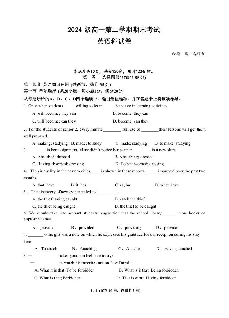 高一下期末考试 英语.docx