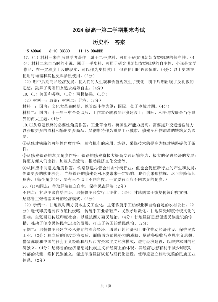高一下期末考试 历史答案.docx