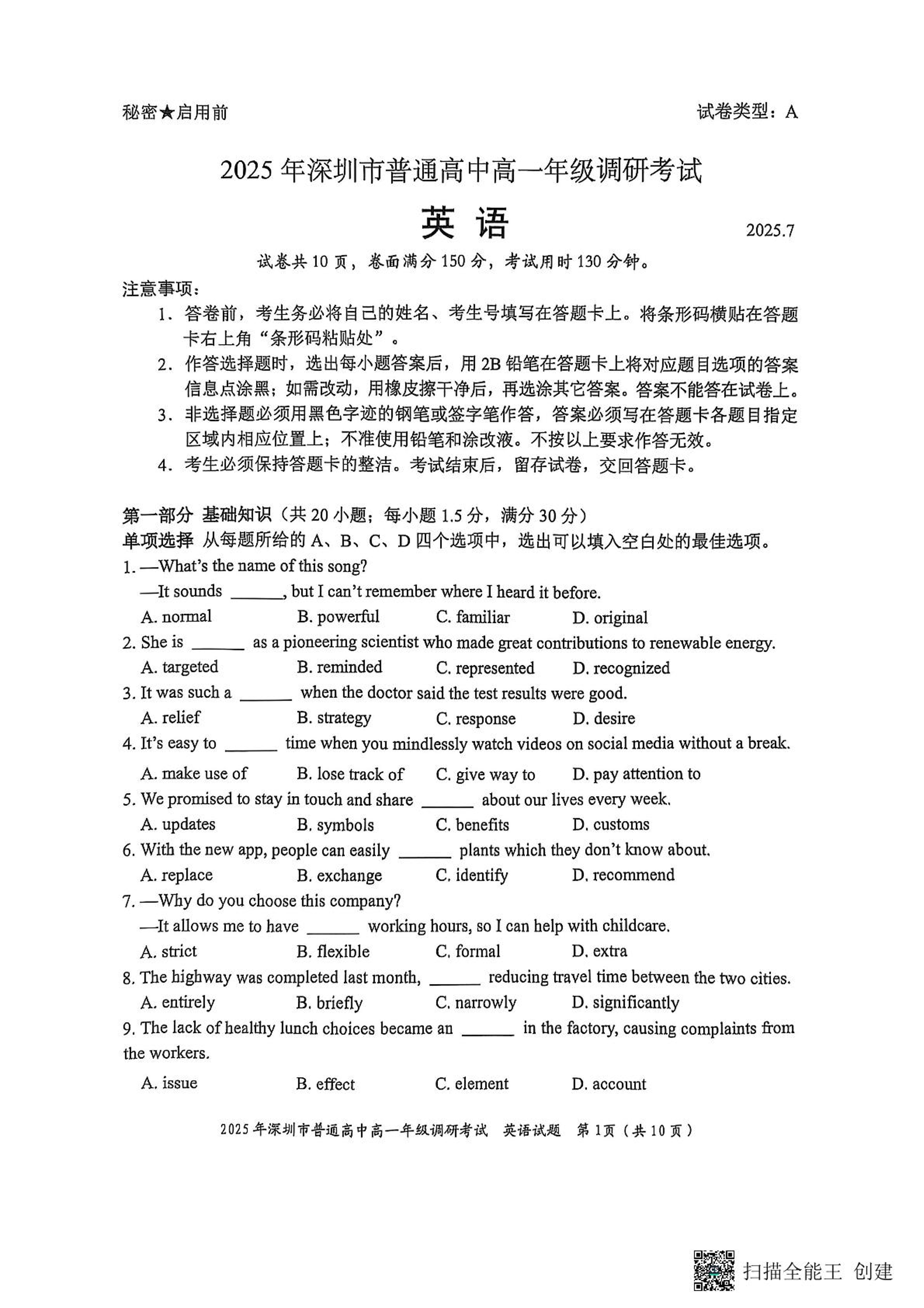 2025年深圳市普通高中高一年级调研考试 英语.pdf