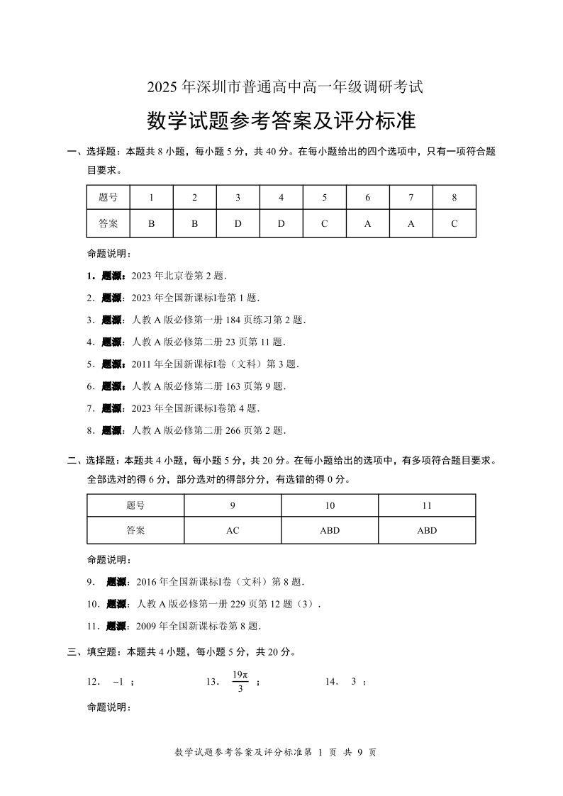 2025年深圳市普通高中高一年级调研考试 数学答案.pdf