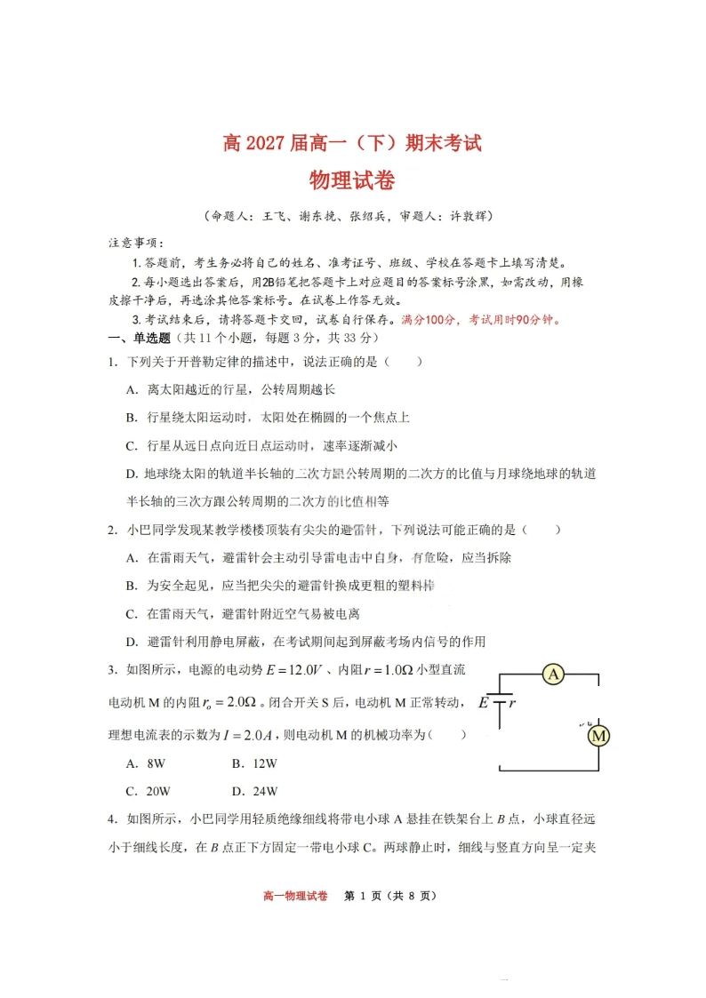 重庆市巴蜀中学教育集团高2027届高一(下)期末考试 物理.pdf
