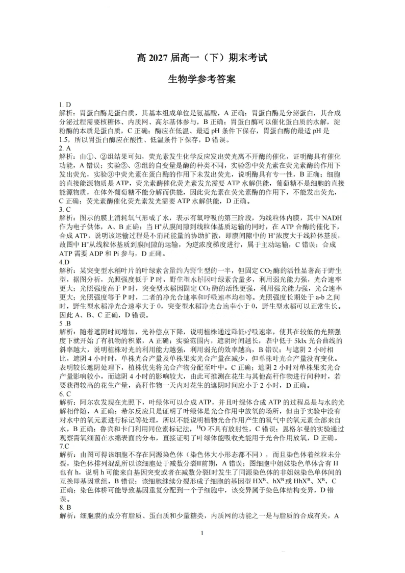 重庆市巴蜀中学教育集团高2027届高一(下)期末考试 生物答案.pdf