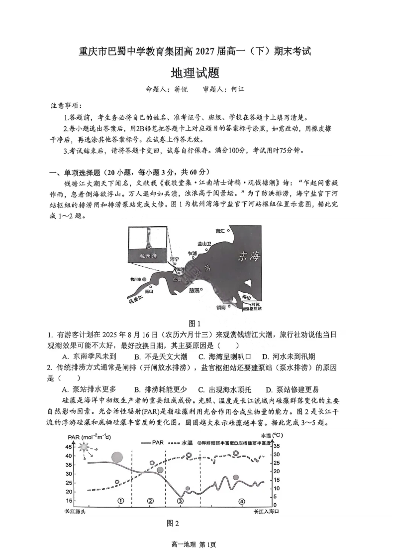 重庆市巴蜀中学教育集团高2027届高一(下)期末考试 地理.pdf