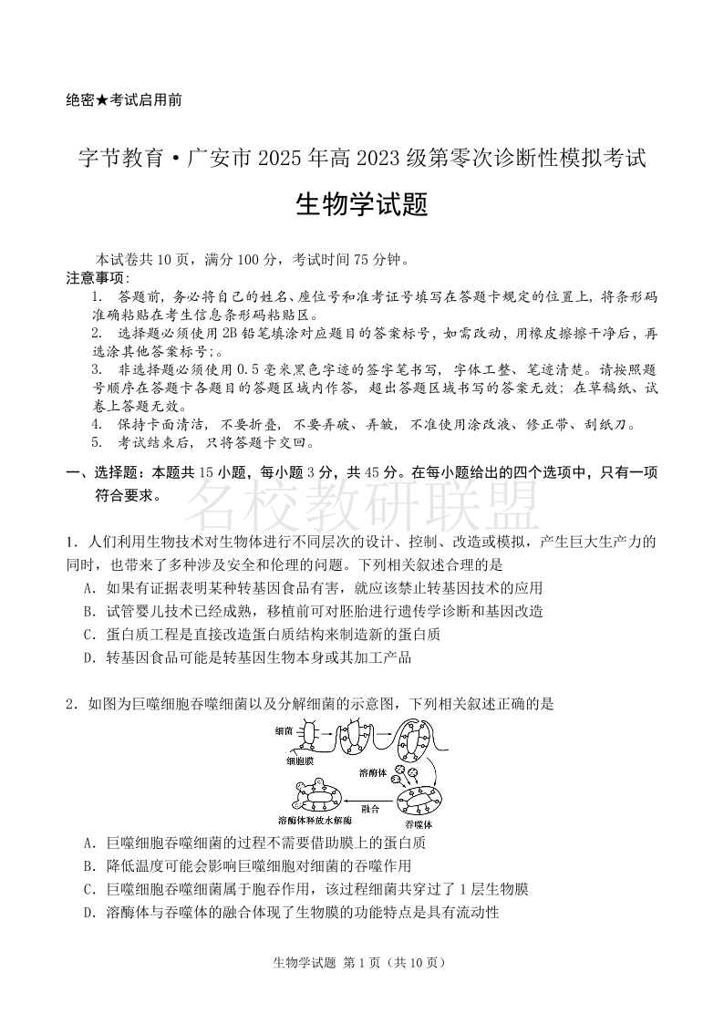 广安市高2026届第零次诊断性模拟考试 生物试卷(含答案).pdf