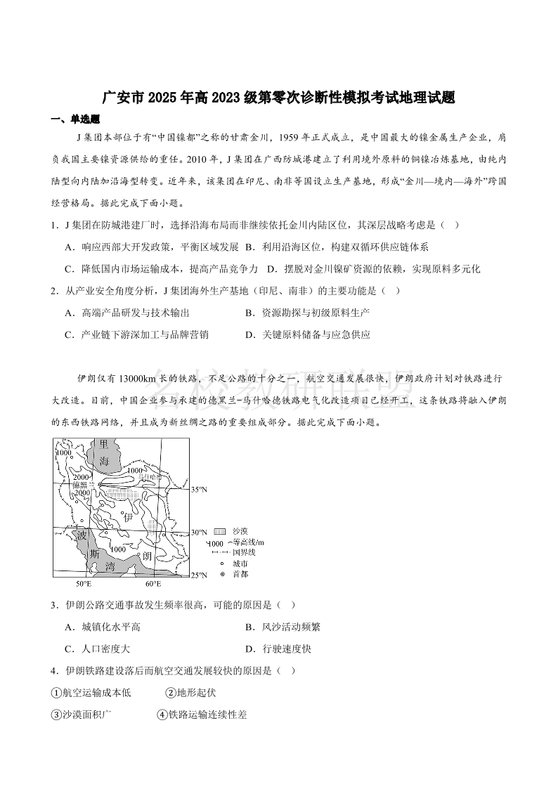 广安市高2026届第零次诊断性模拟考试 地理试卷(含答案).pdf