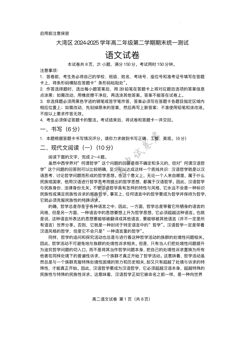 大湾区2024-2025学年高二年级第二学期期末统一测试 语文试卷(含答案).pdf