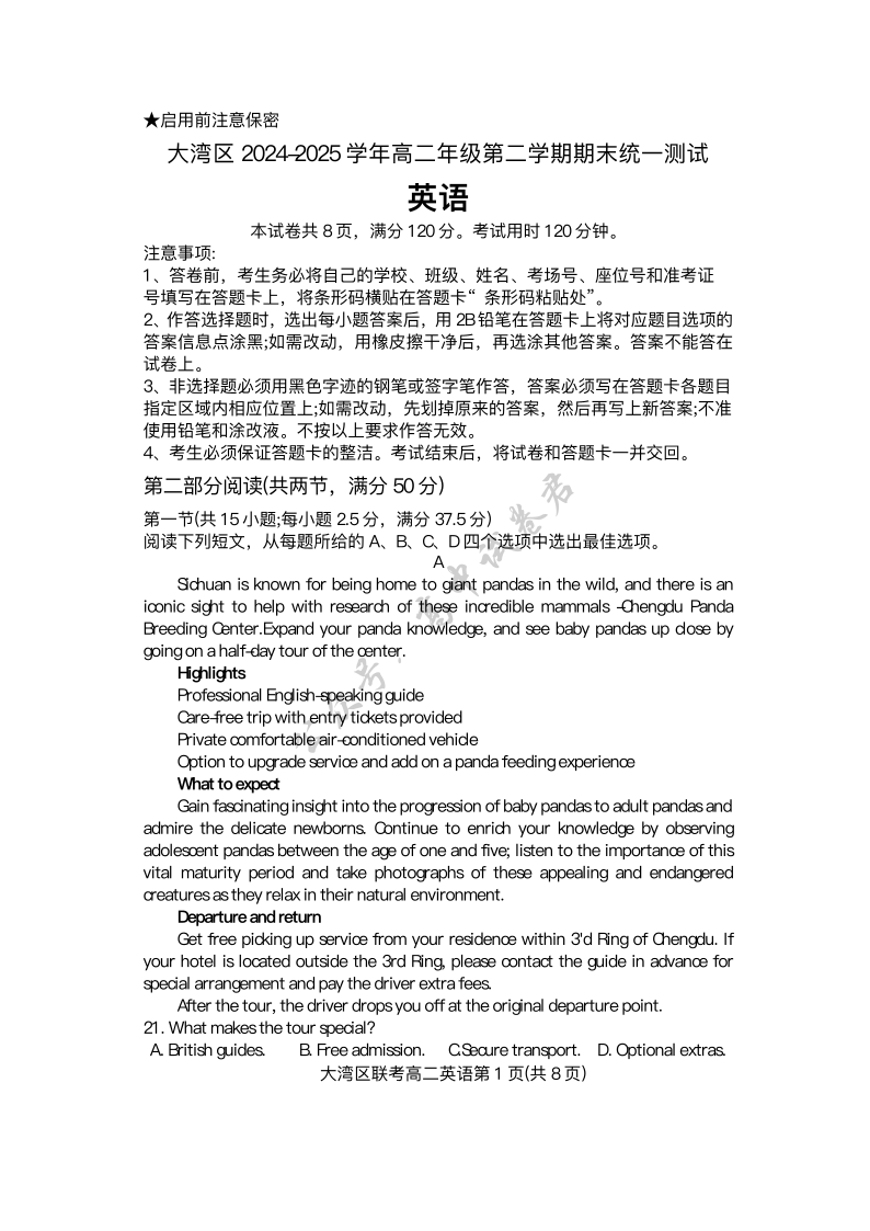 大湾区2024-2025学年高二年级第二学期期末统一测试 英语试卷(含答案).pdf