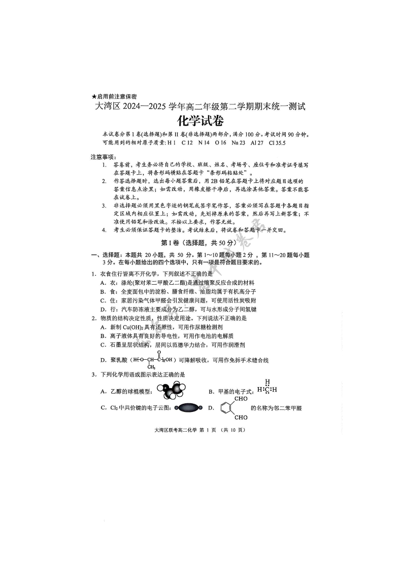 大湾区2024-2025学年高二年级第二学期期末统一测试 化学试卷(含答案).pdf