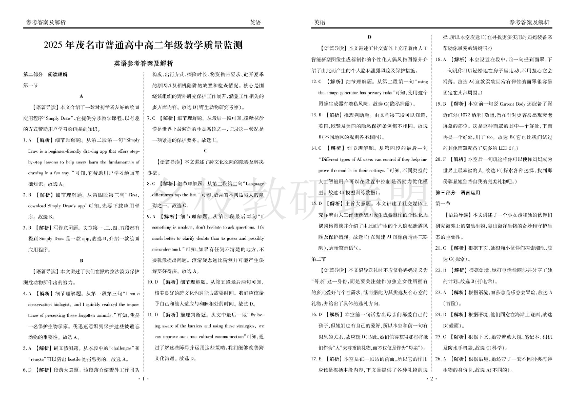 2025年茂名市普通高中高二年级教学质量检测 英语答案.pdf