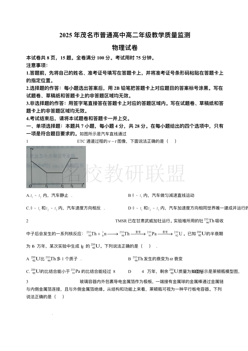 2025年茂名市普通高中高二年级教学质量检测 物理(含答案).pdf