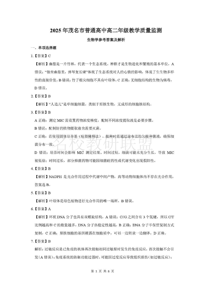 2025年茂名市普通高中高二年级教学质量检测 生物答案.pdf