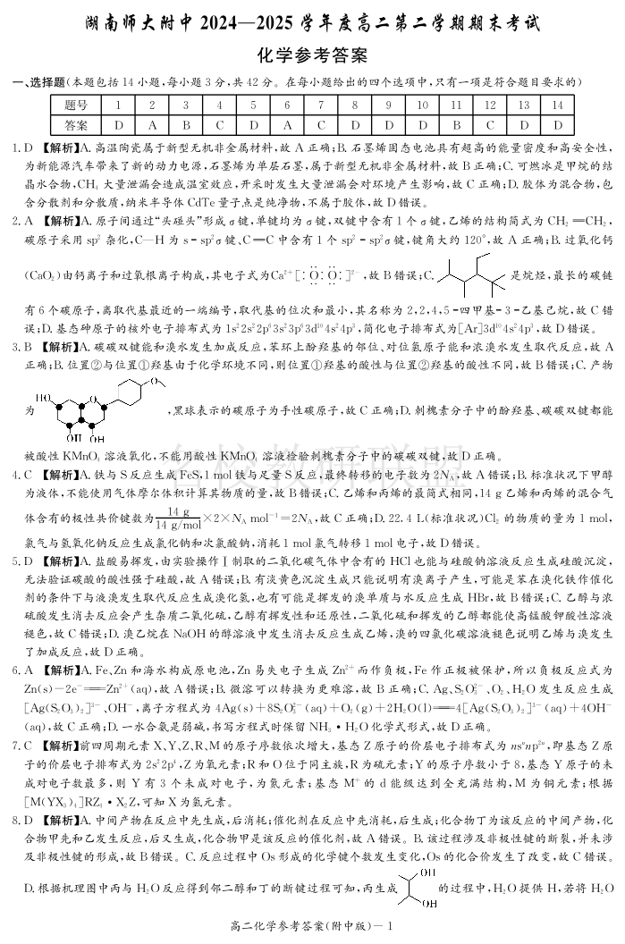 化学答案-湖南师大附中2024-2025高二下期末.pdf